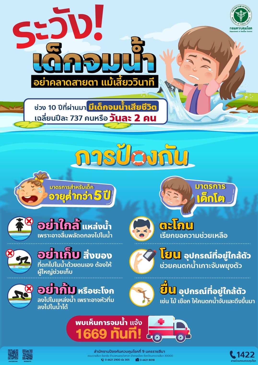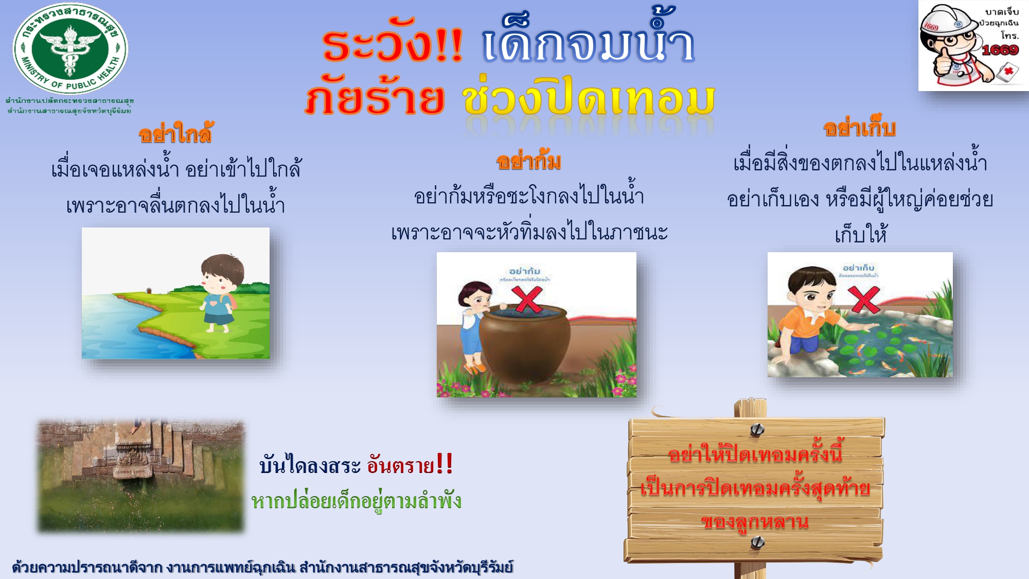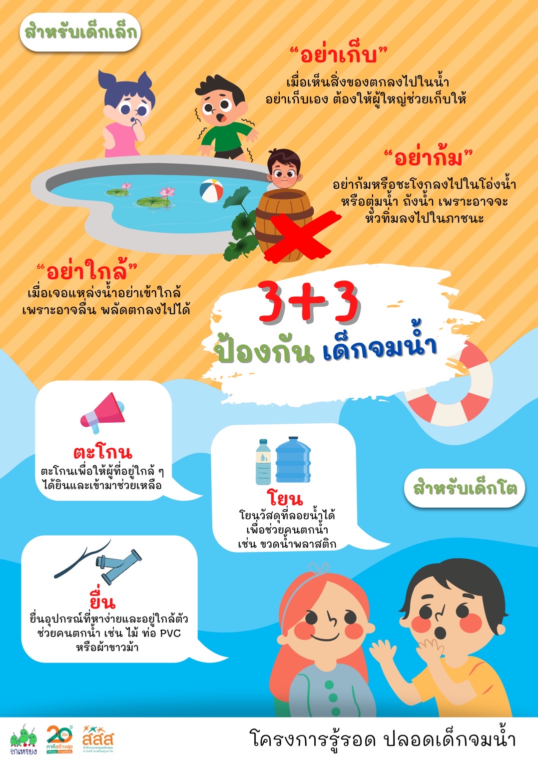 3. สำหรับชุมชน : ช่วยกันเฝ้าระวังแหล่งน้ำเสี่ยงในพื้นที่ ติดป้ายเตือน จัดให้มีอุปกรณ์ช่วยคนตกน้ำที่หาได้ง่าย เช่น ถังแกลลอนเปล่าผูกเชือก หรือไม้ไผ่ ไว้บริเวณแหล่งน้ำ